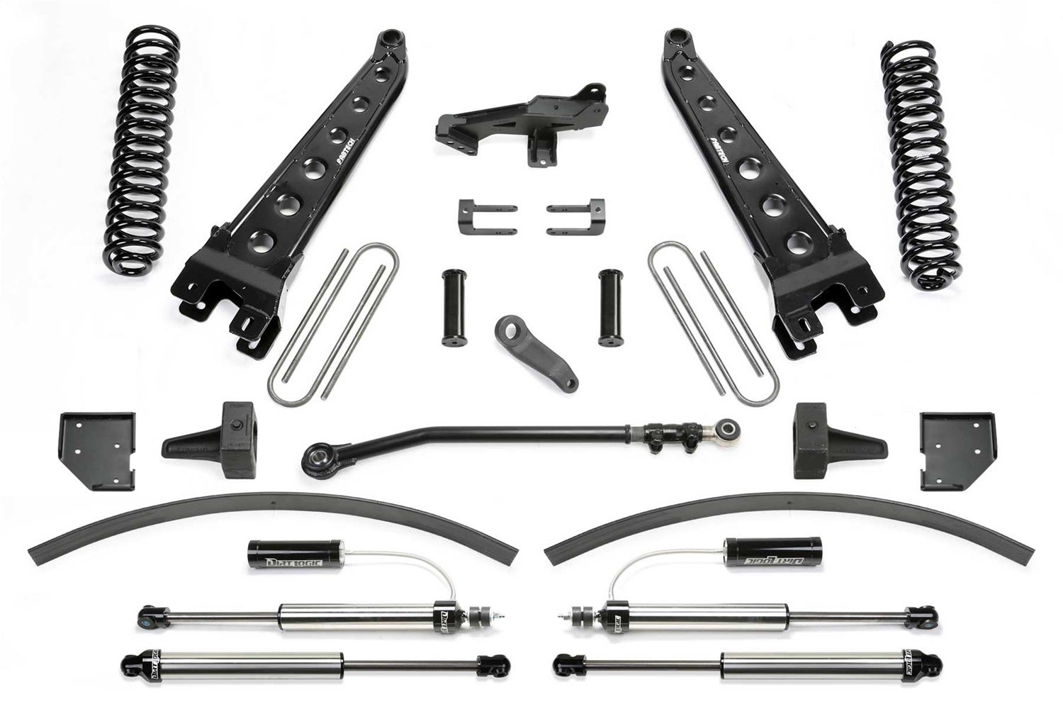 Our patented Radius Arms feature a full tubular structure strengthened by dimple die side plates, with an adjustable alignment cam at the axle to allow caster adjustment. Front spring lift options includes 6 replacement Coil Springs. Completing this system is a Trac Bar relocation bracket, Pitman Arm, Sway Bar drops, and a rear Block & U-bolt kit.